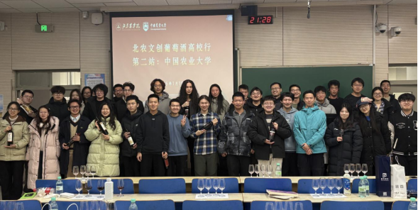 据悉,北农文创葡萄酒高校行自启动以来,首场品鉴会在北京农学院科技综合楼火热开启,获得校内师生一致好评。第二站也于2026年1月15日晚在中国农业大学成功举办。该站活动以文创葡萄酒品鉴与产业科普为核心,向中国农业大学师生展示了北农葡萄酒研发成果与助农实践,为系列高校巡礼活动奠定了良好基础。